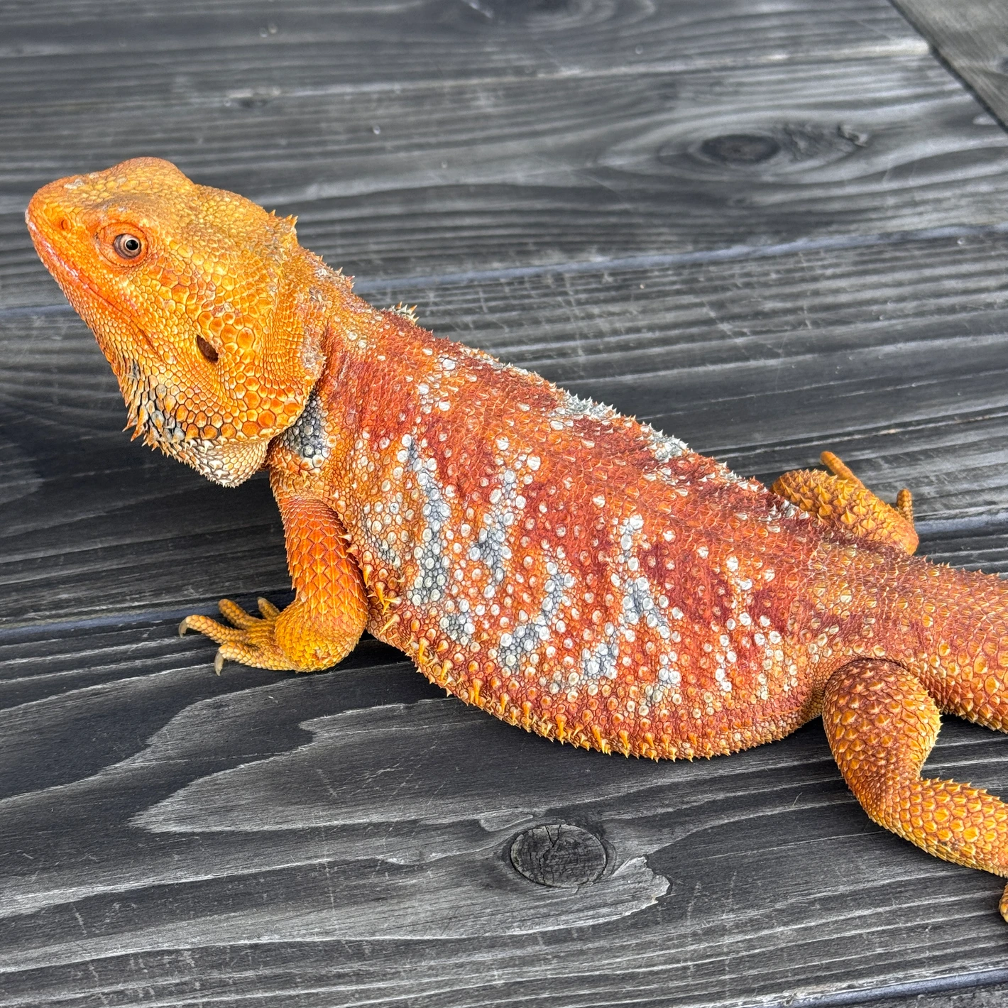 This adult male Hypo Tiger Bearded Dragon is fully Ready-To-Breed, weighing in at over 375g and showing strong hormonal activity. With reduced melanin (Hypo trait) and bold tiger striping, he’s a visual standout and a genetic asset for any breeding program.